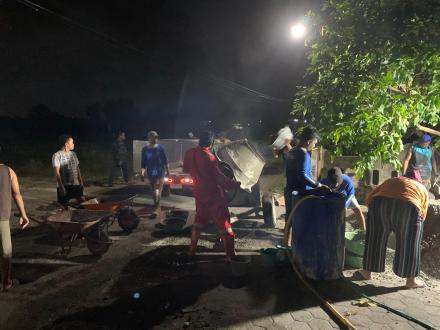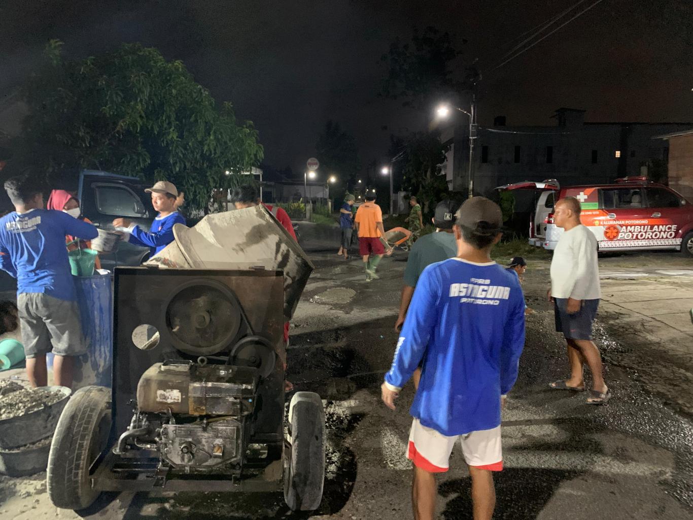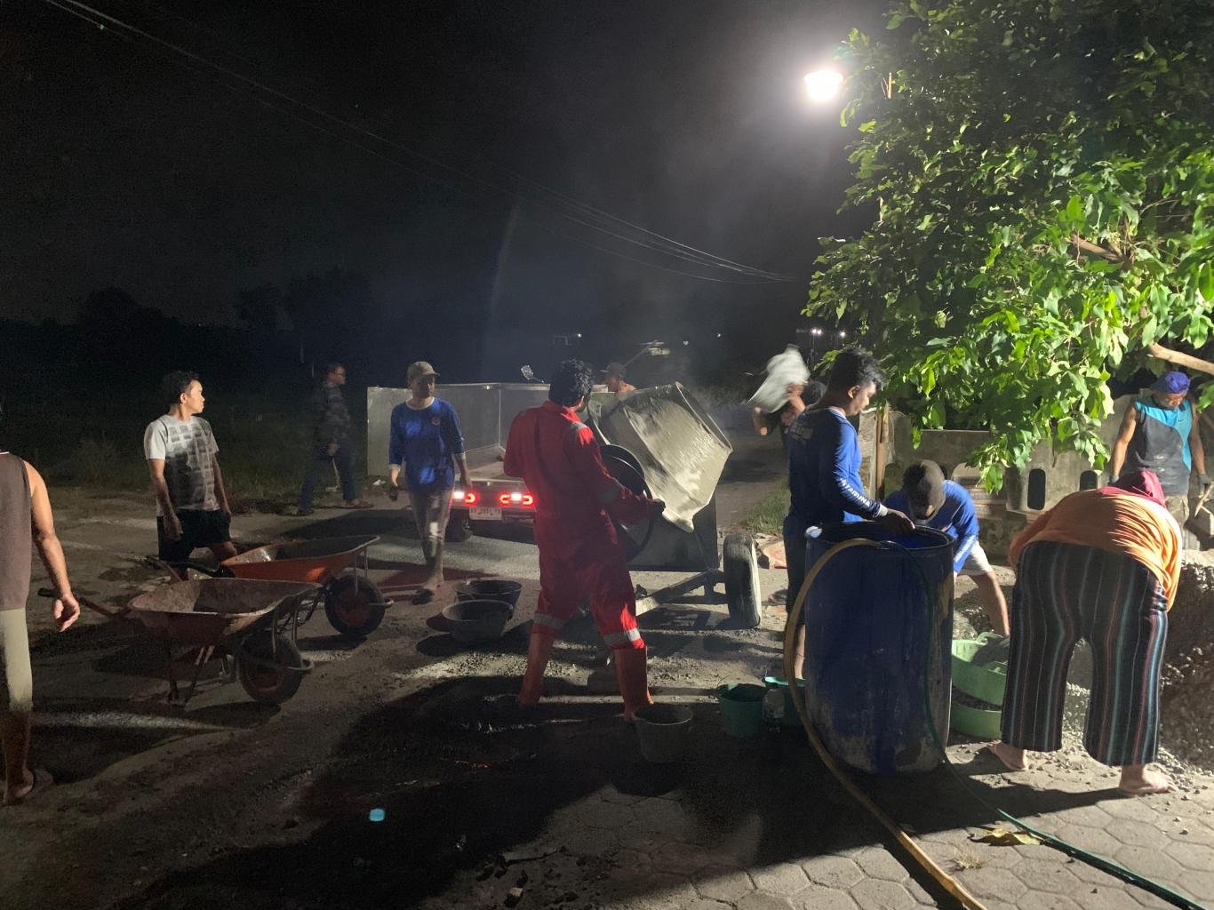 Giat dimulai pukul 19.30 WIB hingga selesai, anggota FPRB berangkat dari Pos FPRB Astaguna menuju lokasi. Material, peralatan, dan armada pengangkut telah disiapkan untuk melaksanakan kegiatan ini. Personil yang hadir bergotong-royong dengan masyarakat sekitar, bahu membahu melaksanakan kegiatan ini. Material cor yang diaduk menggunakan molen kemudian dituangkan ke lubang-lubang yang ada di sepanjang jalan tersebut.