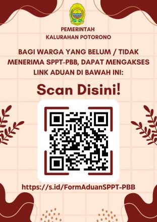 Info Potorono - Bagi warga Kalurahan Potorono yang belum / tidak menerima SPPT-PBB, dapat mengakses Link Aduan melalui klik gambar dan Scan QR Code, atau klik link dibawah ini. (Admin)